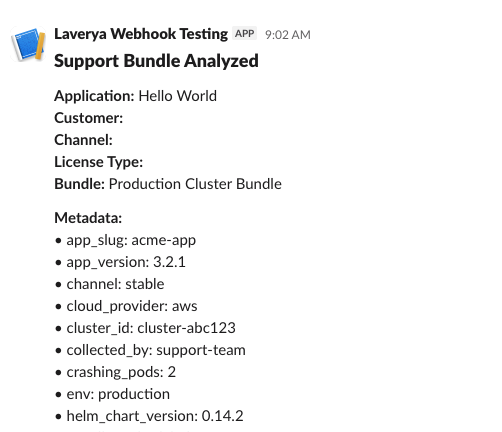 Enhanced support bundle metadata and naming. Vendors can now use the SDK API to capture metadata including severity, environment, error type, support ticket ID, and customer notes alongside support bundles at collection time. The Vendor Portal extracts metadata from support bundles when they are uploaded, and uses the metadata to automatically set a customizable display name for the bundle. The support bundle name and metadata fields are also included in the message for all Support Bundle Analyzed event notifications. Docs.