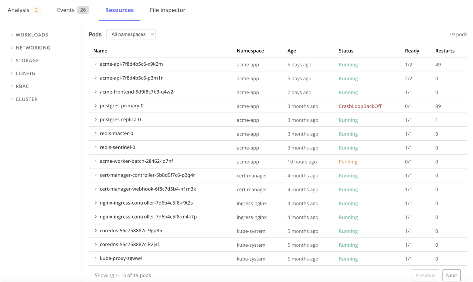 Structured support bundle views in the Vendor Portal. Vendors can browse Kubernetes events, pod statuses, container logs, and resource inventory directly in the Vendor Portal support bundle detail page without having to download and extract the bundle.