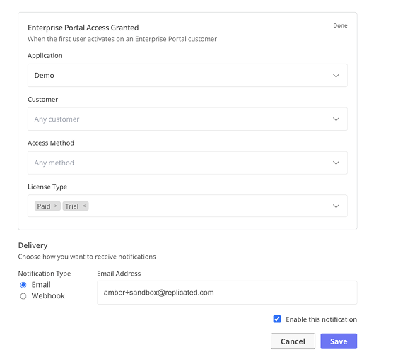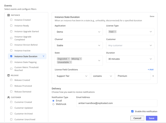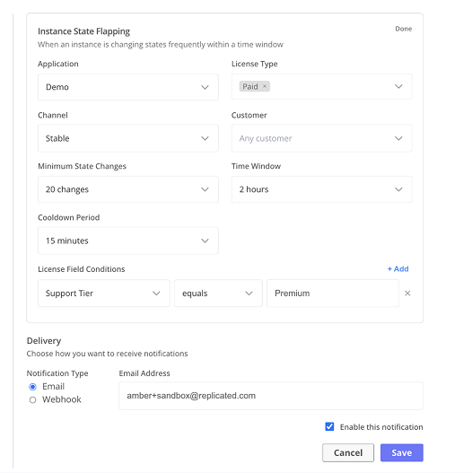 Notifications can be scoped down to a specific application, customer, channel, license type, or even custom license field values.