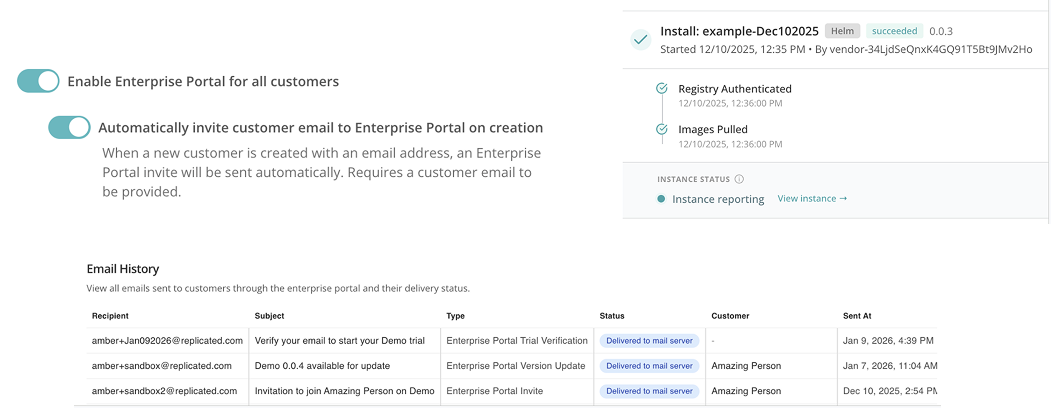 The system also introduces more precise lifecycle signals, including when an instance is ready after an install or upgrade, when an upgrade has completed successfully, and when users are invited to or join the Enterprise Portal. These events are also available as queryable timestamps through the Vendor API.