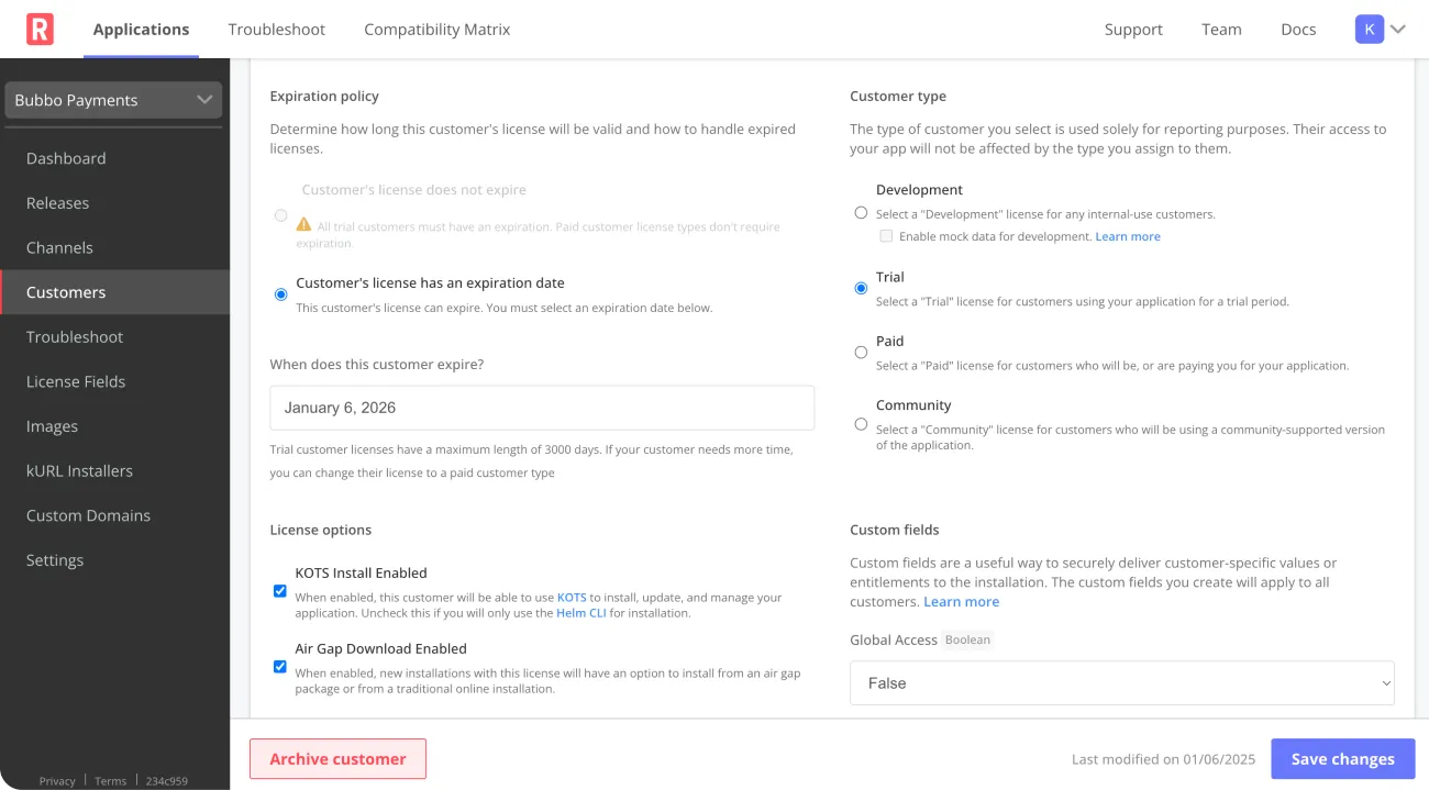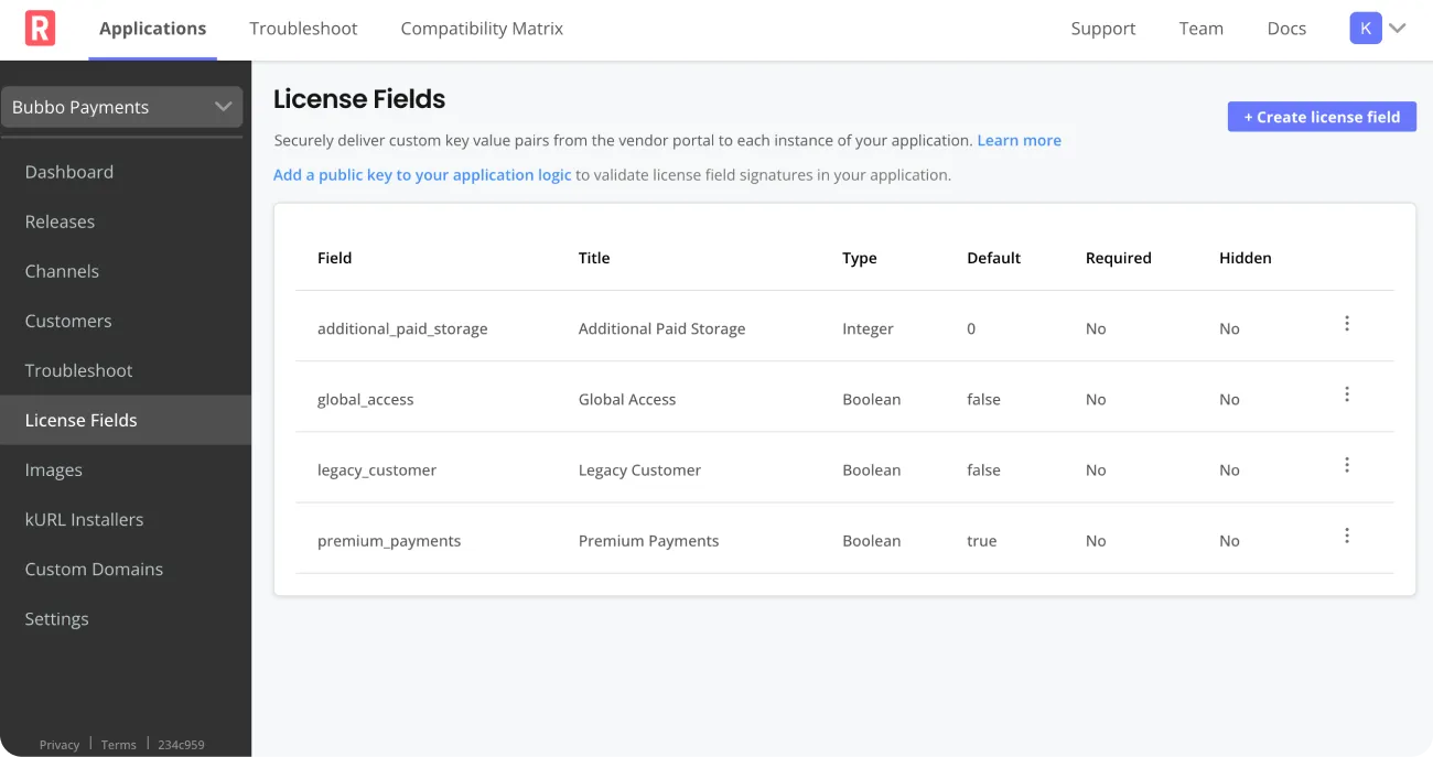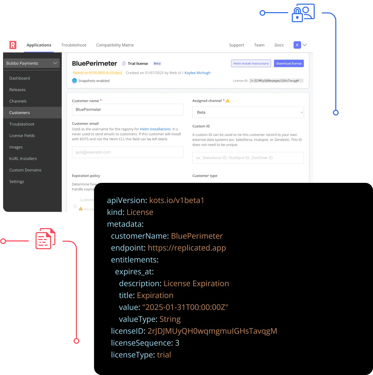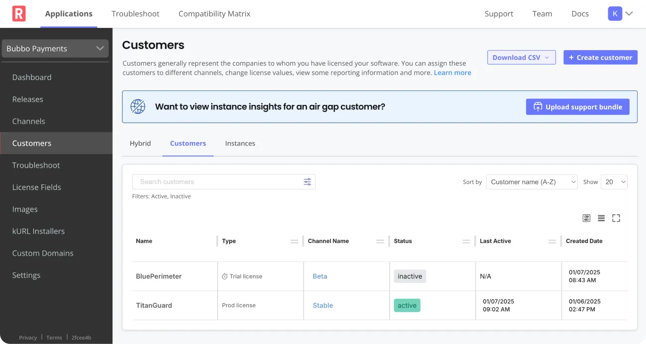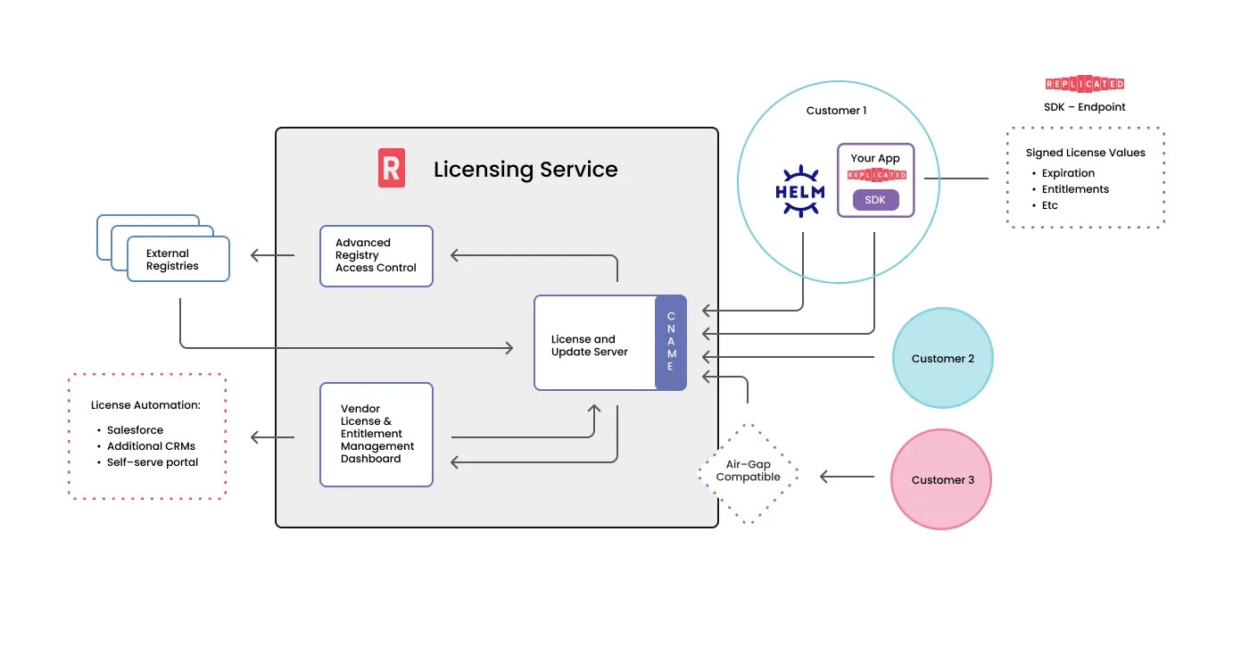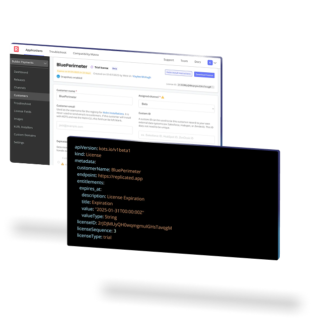 Use our API or Vendor Portal to assign unique, signed licenses to customers that represent their license type, entitlements, expiration, and more. Dual support for both online and air gap customer environments. Update licenses confidently, knowing they’re secure and tamper resistant.