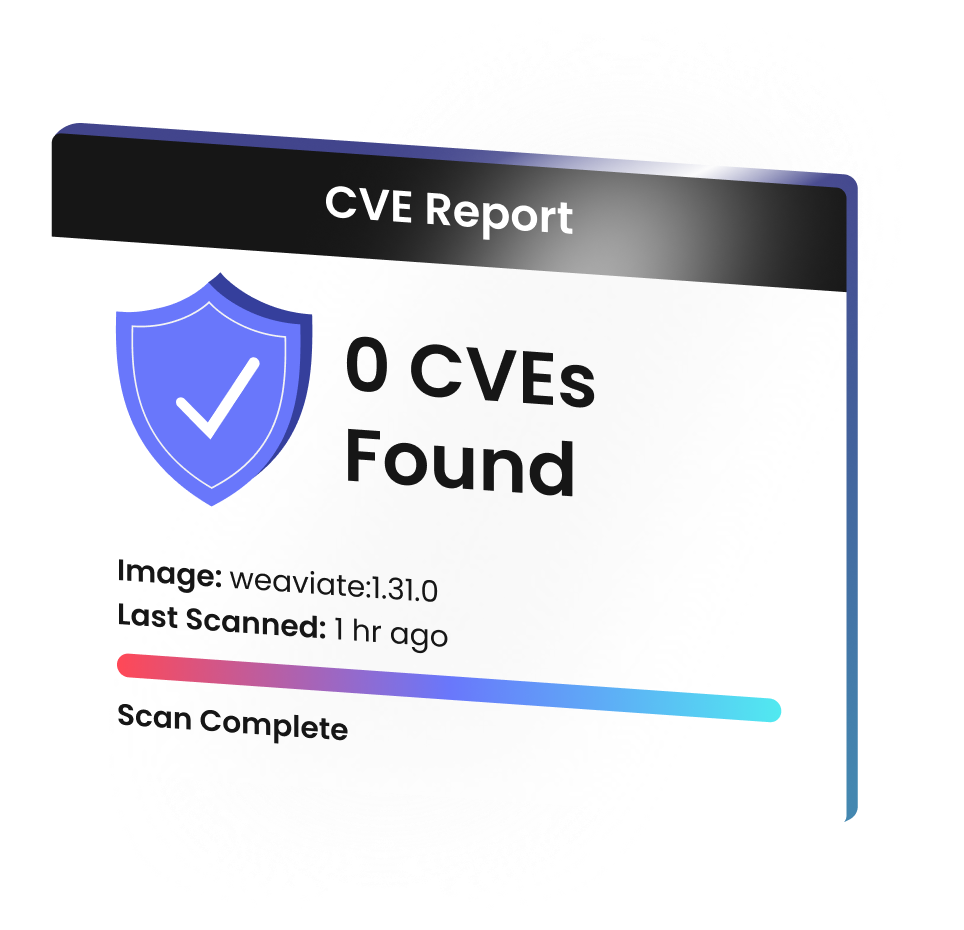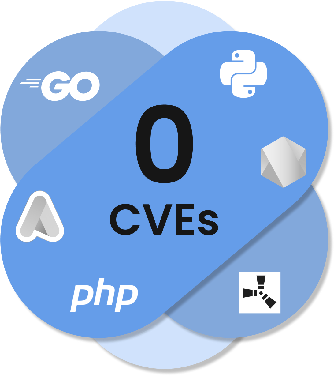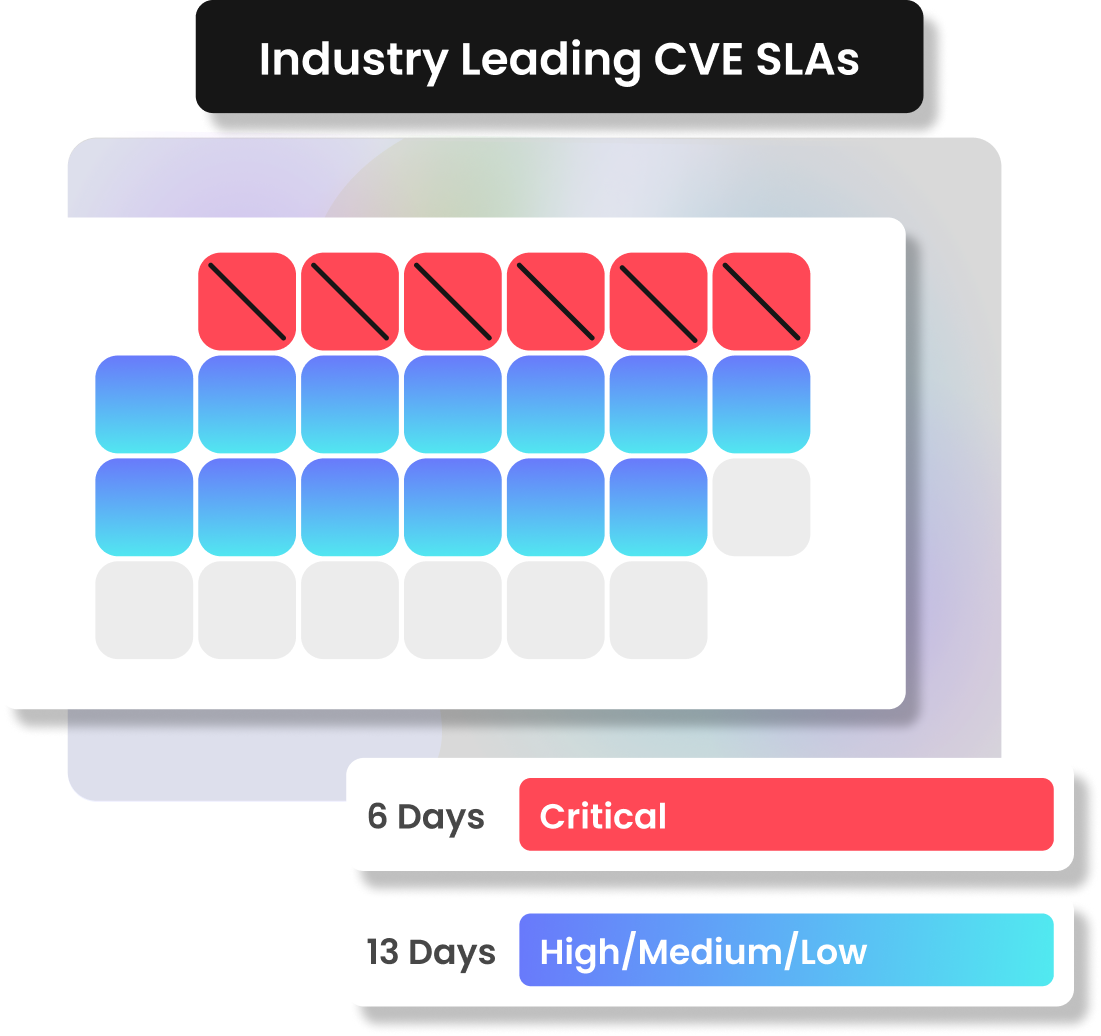 Industry leading CVE SLAs. 6 Day SLA for critical CVEs and 13 Days for High, Medium and Low. We continuously scan images and update all dependencies, and dependencies of dependencies, when fixes are released upstream. Don't see an image you need? We can work with you to have it available in a manner of hours.