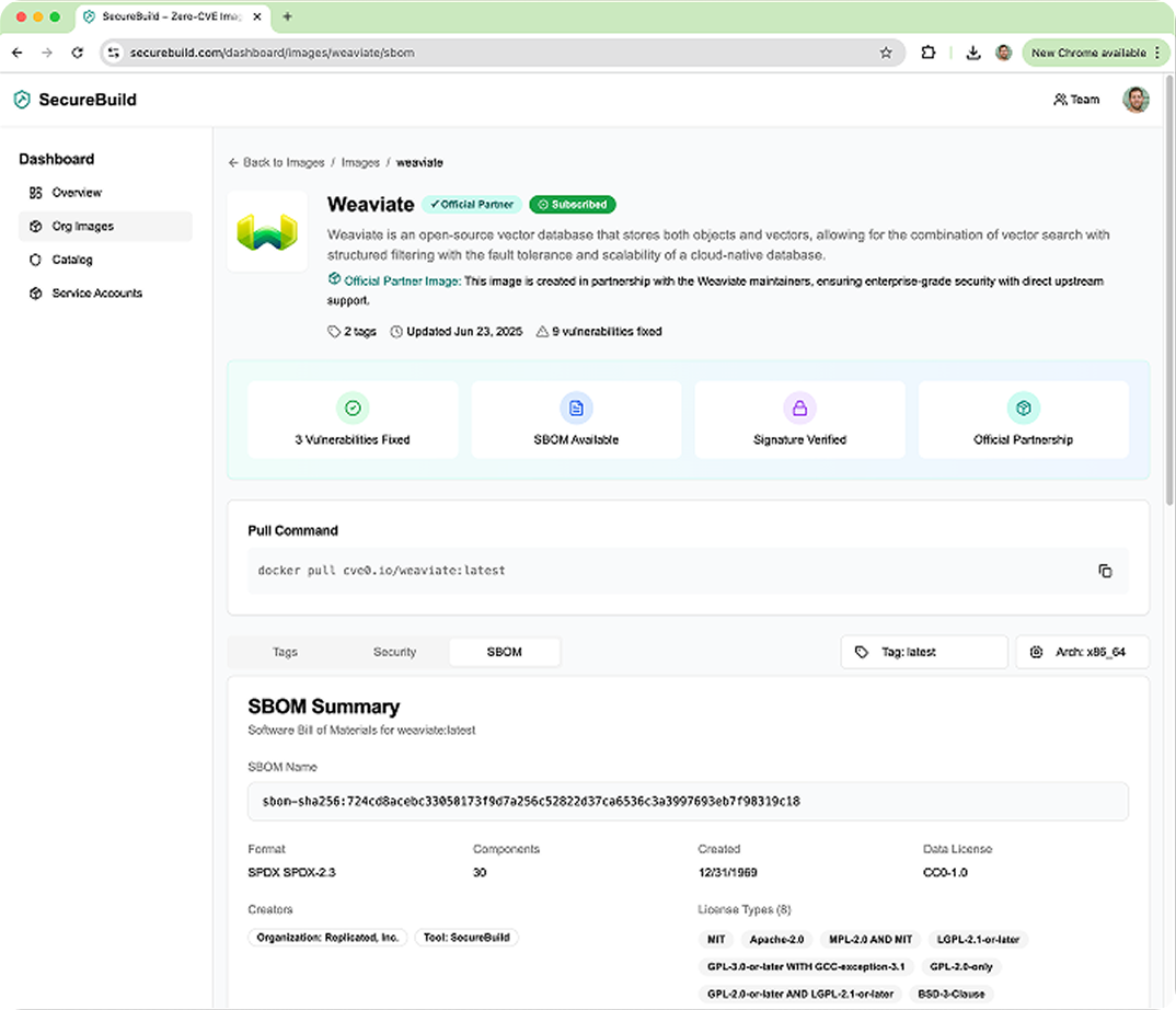 Replicated's SecureBuild provides ISVs with popular open source images rebuilt from source on trusted hardware. Every image dependency has been fully mapped, and rebuilt with attestations & SBOMs. The resulting0-CVE imagesare then tested and verified as drop in replacements for images that often have 10s or 100s of CVEs.