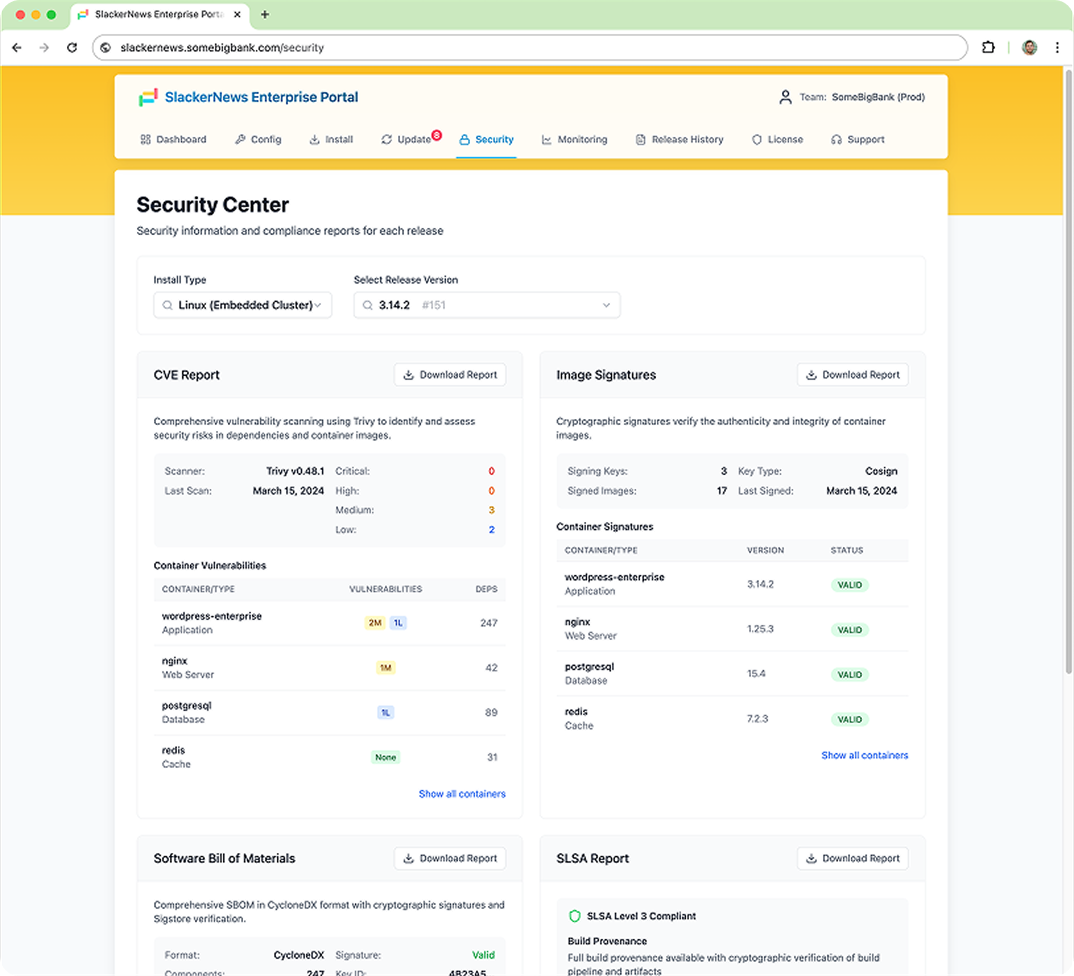 Deep integration with the Enterprise Portal Security Center to share key security artifacts (CVE scans, SBOMs, and more) with each release for your customers to consume, driving customer transparency, reduced security questionnaire burden, and adoption of newer, more secure versions of your application.