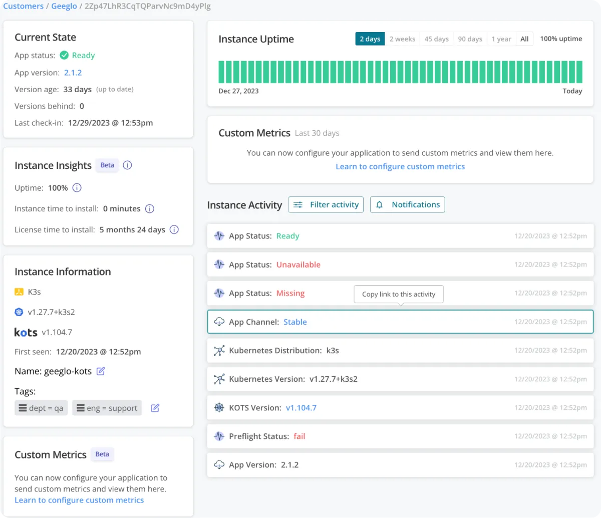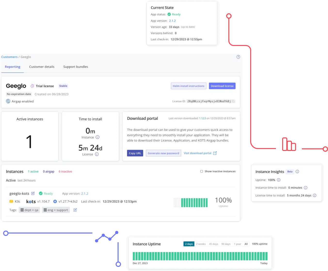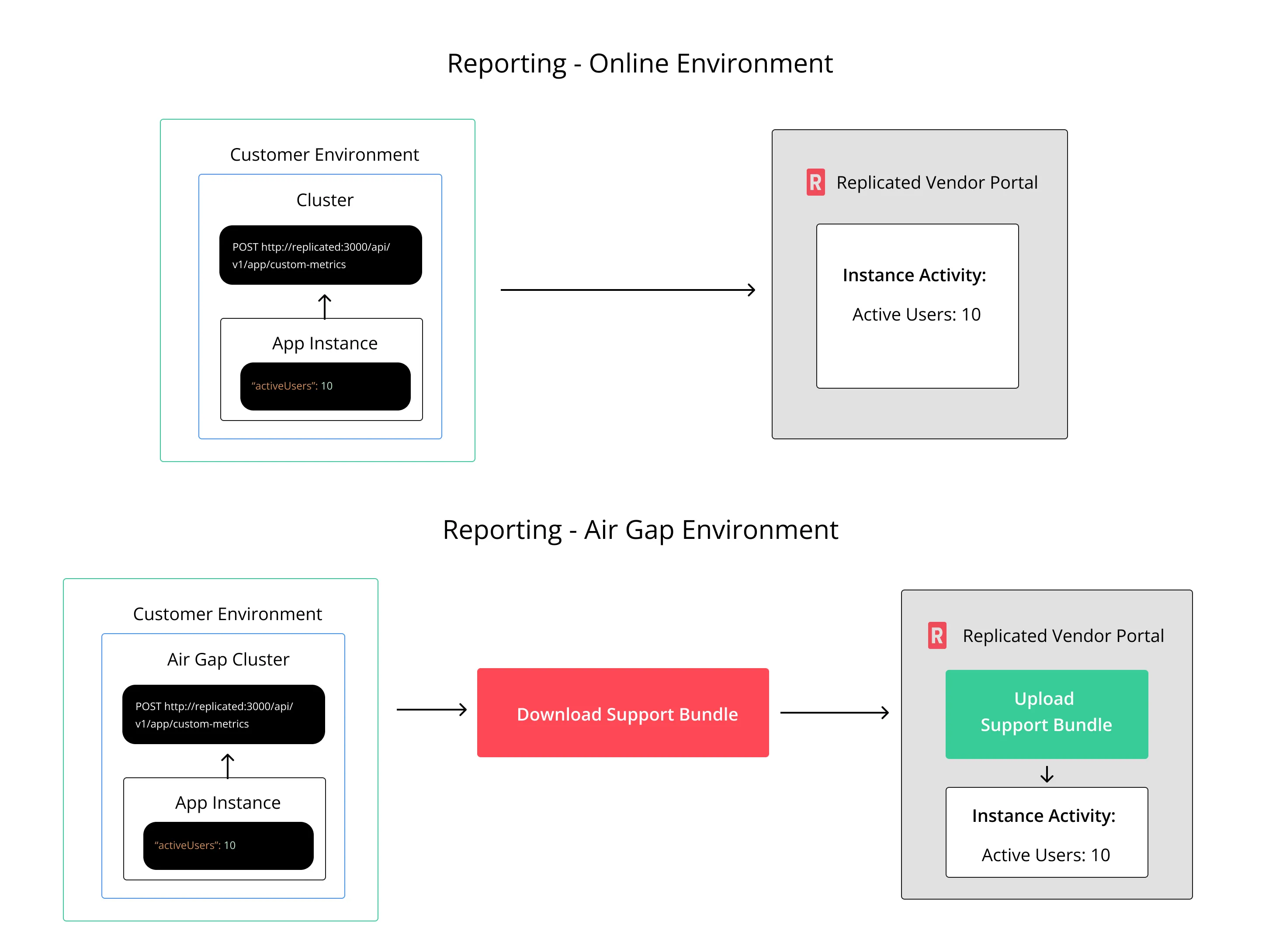 Replicated's reporting and telemetry collect application instance data to monitor health, status, and performance. In online environments, data is sent to the Vendor Portal. In air-gapped setups, it's stored locally and uploaded via support bundles, enabling real-time insights and issue troubleshooting.