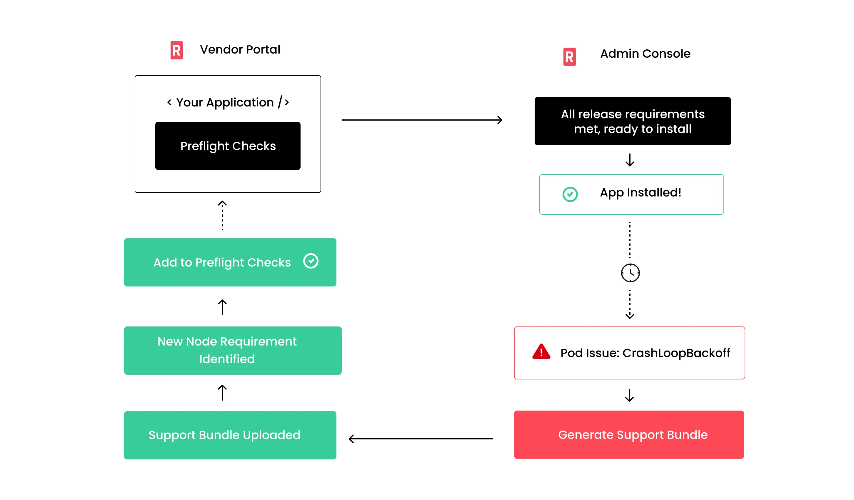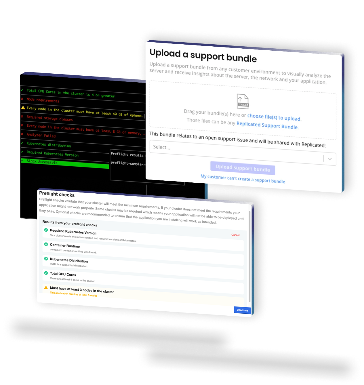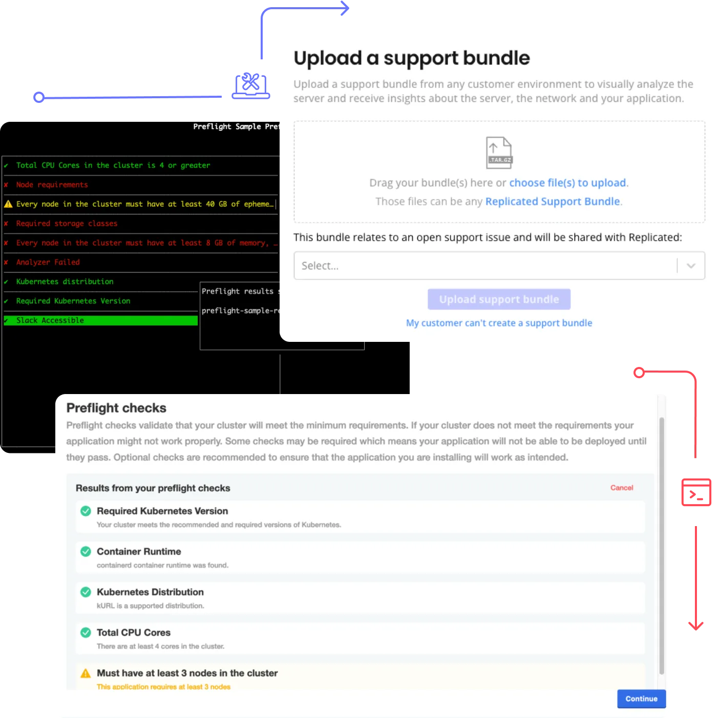Give your customers the best support every step of the way. Preflight checks run before an application is installed to check that the customer environment meets the application requirements. Support bundles collect troubleshooting data from customer environments to help users diagnose problems with application deployments.