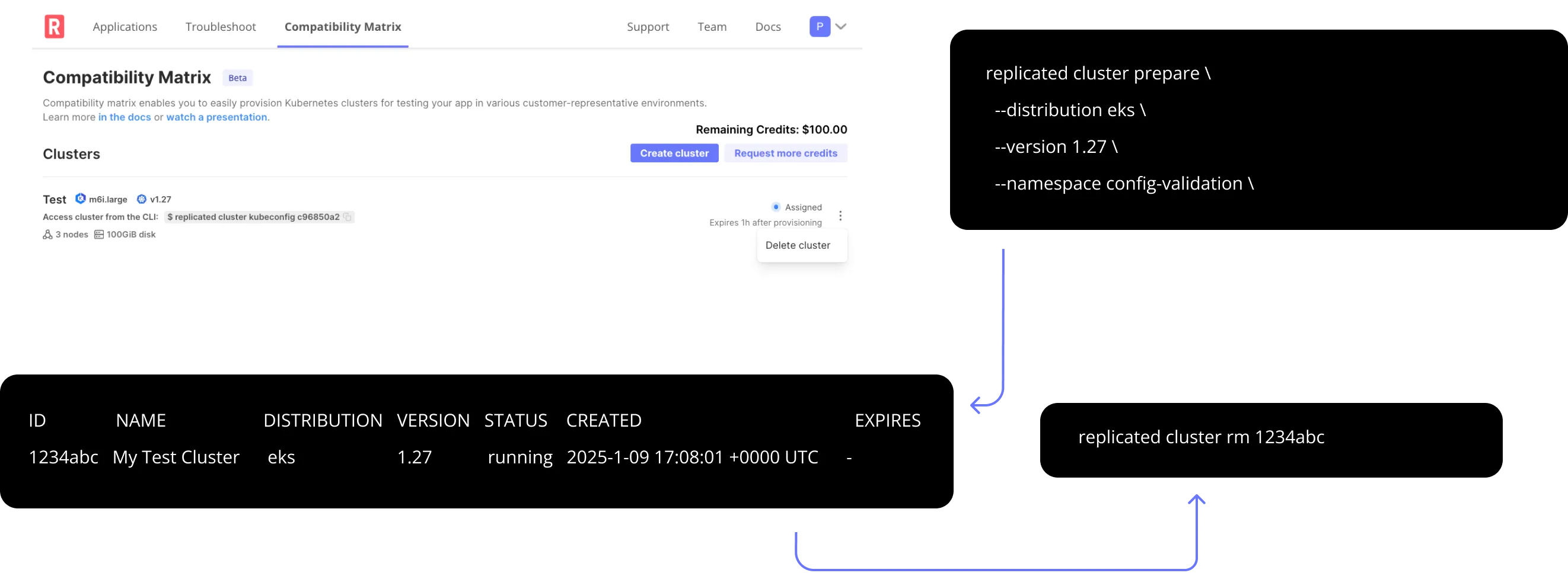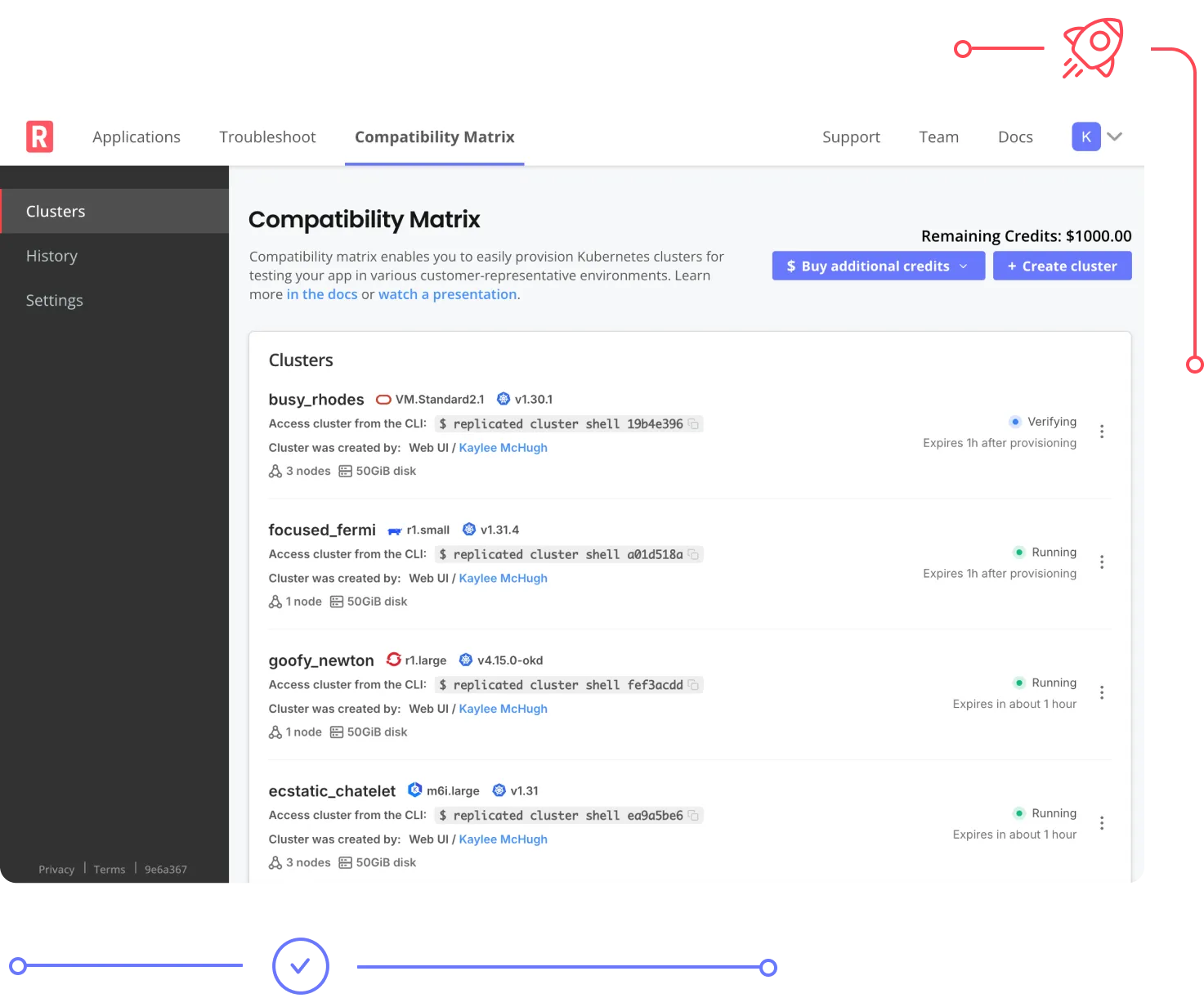 Use Compatibility Matrix to get kubectl access to running clusters within minutes or less. This allows you to more easily test your code in a range of different environments before releasing to customers.