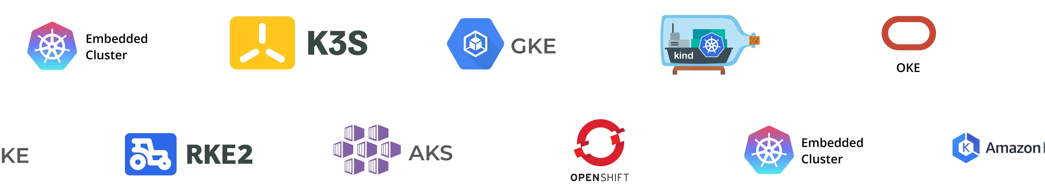 Quickly provisions ephemeral clusters of different Kubernetes distributions and versions, such as OpenShift, EKS, and Replicated kURL.